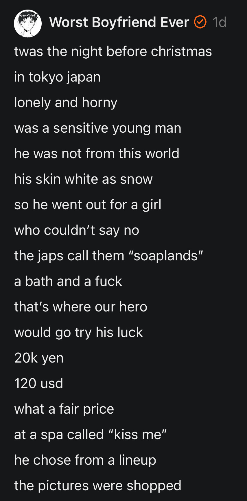 My older reader friend from earlier was waiting outside, a block down the street. He’s not a weird old creep, he’s a banker from Maryland who barely knows of my blog and was recommended to meet me through a friend of a friend. He apparently kills it on Bumble as a white guy here in Tokyo, which I noted. He was very interested in my Soapland experience. I told him all of the above and then we went to a FamilyMart to eat a good snack. It’s all delicious and cheap there. Everyone in that convenience store must have known I was getting a post-prostitute Christmas dinner, because what else does a white guy do in Yoshiwara at 12 AM. Just as Santa Claus was leaving to service East Asia I checked out with a donut, called an Uber, shook my friends’ hand, and fled that whole big dark scene back to my Airbnb.