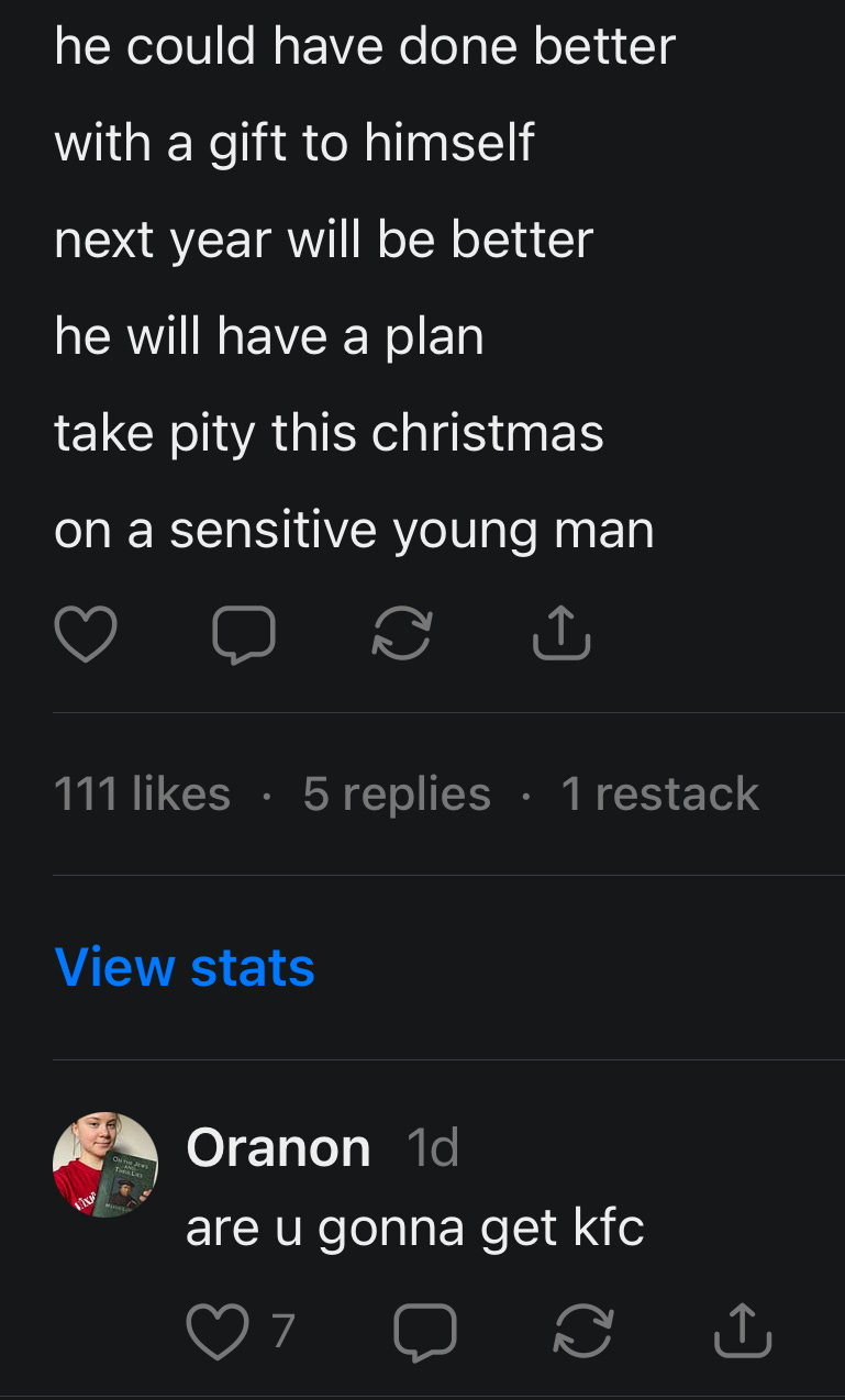 But until then, I’ll keep toiling on. I’ve done a lot of damage to myself in 2025 and my priority in 2026 is to restore my health. I’m getting back in the gym and doing it right this time. I won’t be quitting Adderall because that’s where all the words come from. I’ll find a woman who loves me in spite of my flaws. I’ll figure it out, and when I do, I’ll let you know how I did it.