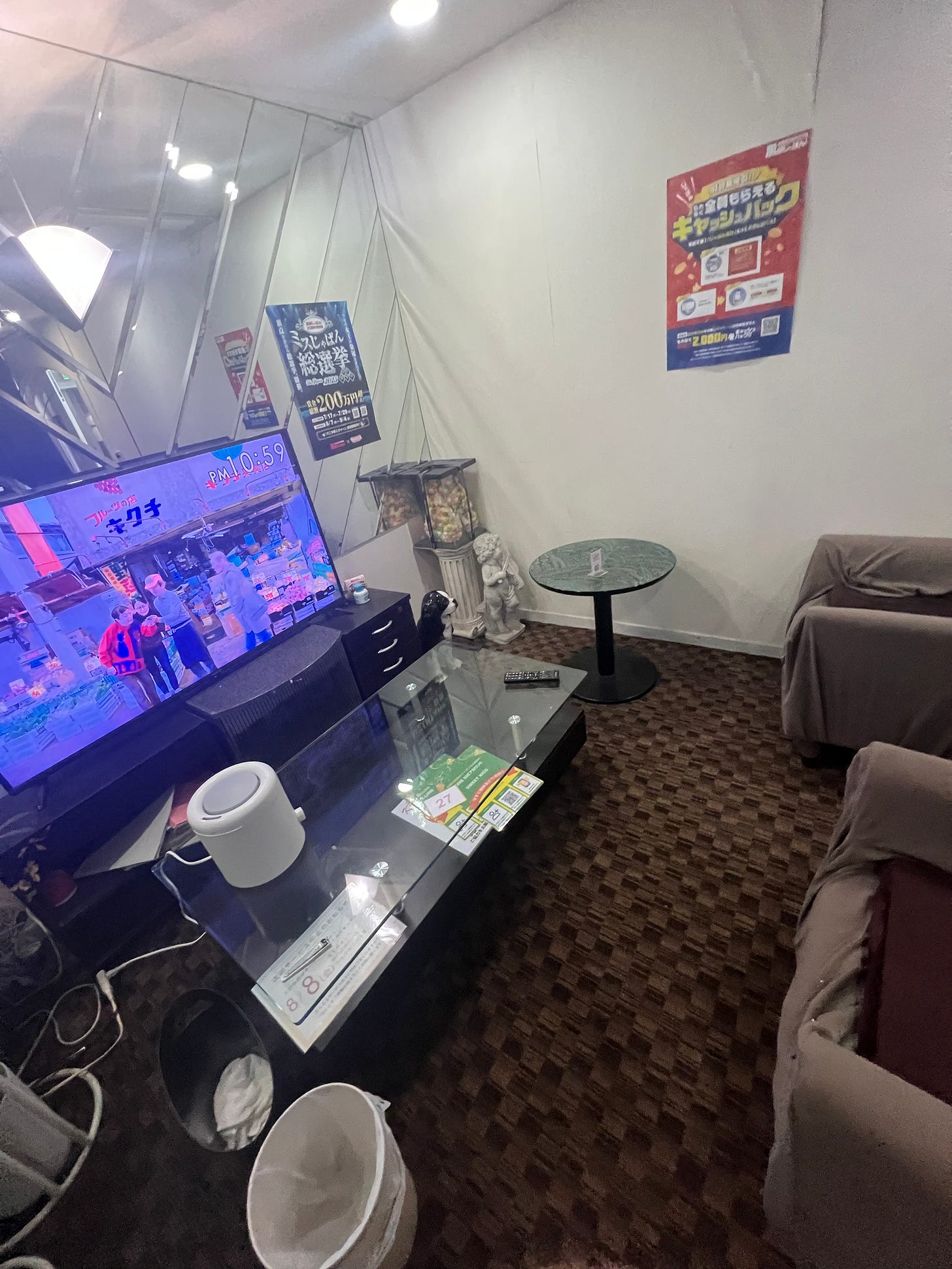 This room makes me laugh: it has the vibe of some Japanese guy’s man cave apartment. Comfy couches and a huge TV screen. Big mirror on the wall for some reason. A fridge. I got the sense I could fall asleep there, rent it out for $30 a night if I asked. I sat there for about 8 minutes flipping through Japanese romcoms and commercials giggling sadly about the pathetic state of my life. I’m paying for this whole affair using a significant chunk of the money I swindled off that Chinese girl last week. You only live once, am I right.