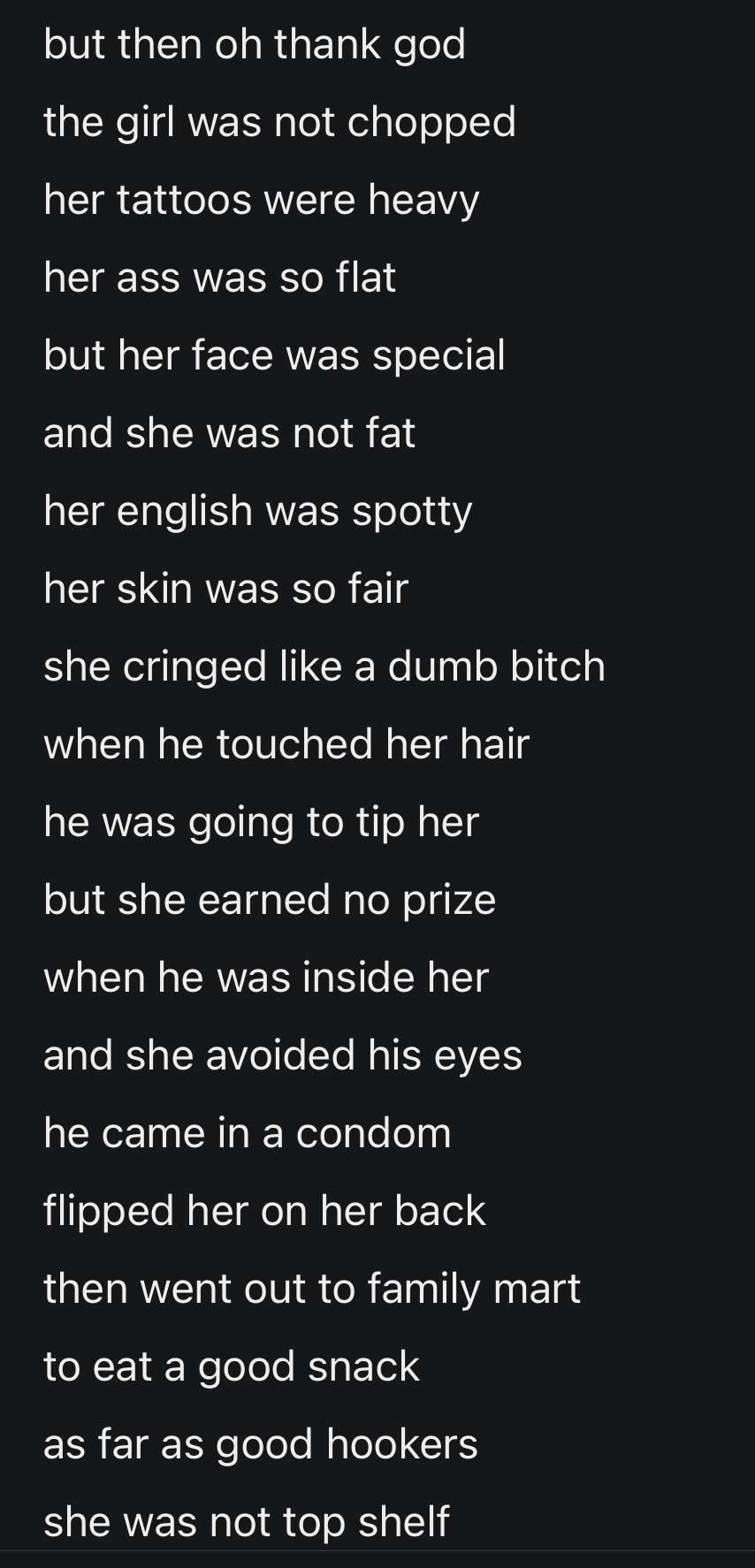 She mounts me in cowgirl like all these girls do. Our rapport is not strong enough for her to ask how I want it. This must be how most boring lazy old slobbish Japanese salarymen like to be fucked. On their backs looking up at this nervous bouncing tatted up prostie as she stares out into the distance eyes closed wincing basically fucking herself. No wonder the birthrate is in freefall. I wouldn’t go so far as to say it was Horrific but it was close… a real nightmare before Christmas situation. It was just another day in the office for this bitch and that depressed me too much to bring me anywhere close to orgasm. Plus I was wearing a condom, which, fair, I probably should be doing that ‘cause she is a prostitute at the end of the day, but the Japanese condoms are always too small and obviously it’s a condom so it kind of kills sex altogether if you’re not really feeling it in the first place.