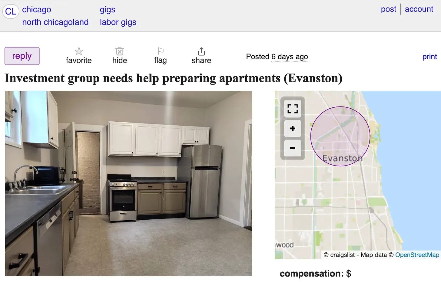 I go on Craigslist. I see a recently posted job in Chicago, Evanston, actually: renovating and cleaning apartments. $25 an hour. Lots of work. Start immediately. Call Frank.