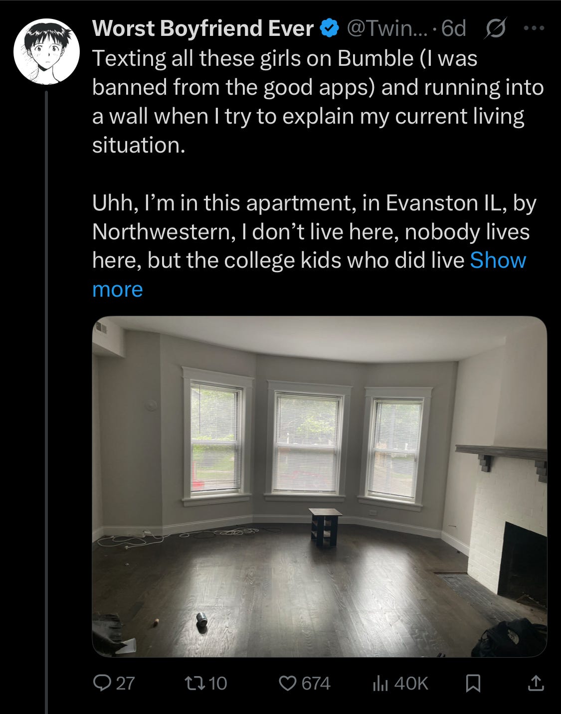 So I asked Frank: hey, can I just sleep in this apartment until the new residents come in? What is it like a week, or two?