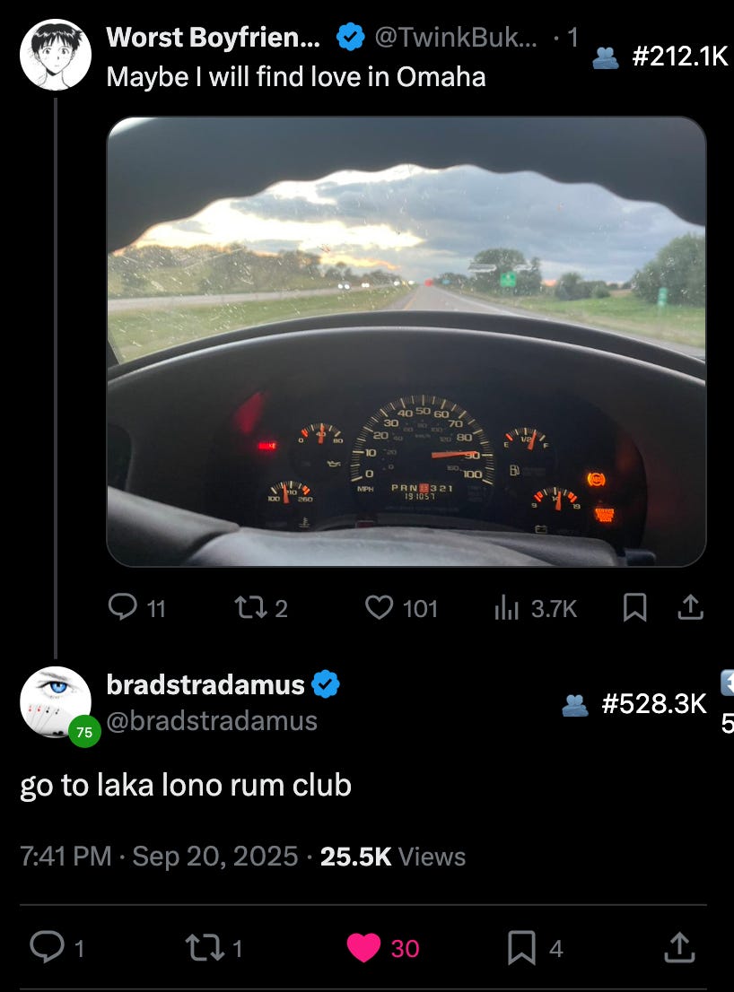 Yesterday I was driving from Iowa City to Omaha, simply because Omaha is the next city heading West. Posted about it on internet. I never check replies because I hate feedback but yesterday my resolve broke, and I saw this: