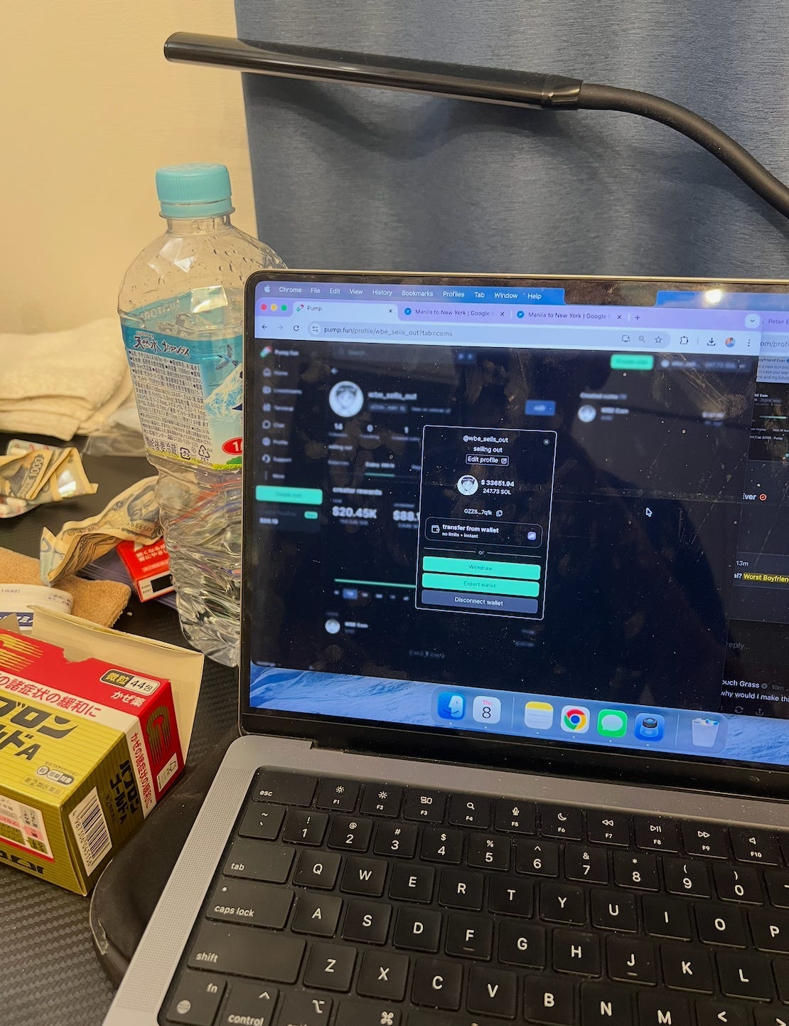 get back to my airbnb. number still going up. if i sell now i make $30k— $12k in creator fees and $18k in WBE coin. my hands are trembling i dont know what to do. this won’t seem like a lot of money to you probably but i’ve been nearly dead-broke for the past year and a half, i bounce between 0 and ~$3k and put all my time and effort into this blog/book/online thing, i was living in a van from oct ‘24 up till a few months ago, which was partially a Bit but also was just a cheap way to see the whole country, now i’m in tokyo still living retardedly but in a slightly less unique and interesting way, sharing it all as i go, straddling the line between social media faggot and literary hero, so this $30k sitting in front of me feels like enormous, world-bending wealth. the kind of wealth that would give me something new to write about besides being broke and fucking women. the kind of wealth that would let me live in new york city for maybe half a year... the kind of wealth that might help me see that girl again... look 30k may be nothing to you but when you live every day like it’s your last, i know it’s a cliche but i mean it, 30k feels like enough to thrive on for several lifetimes.