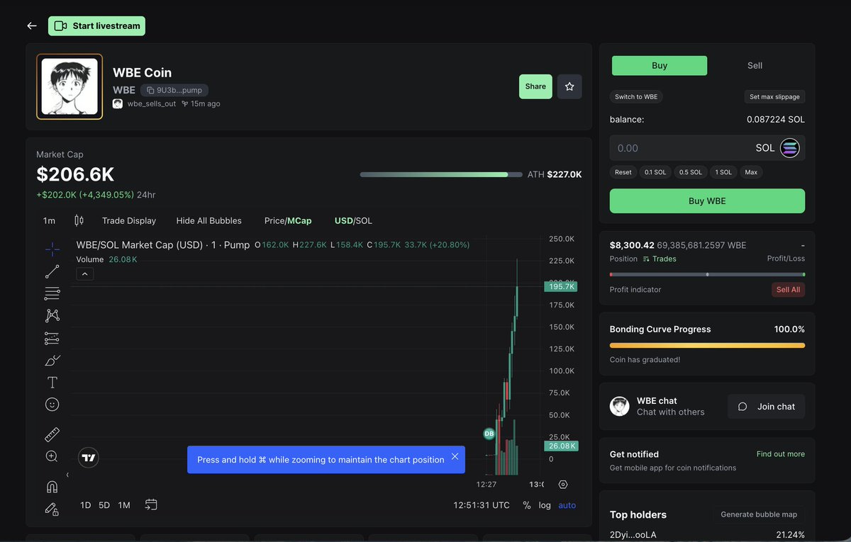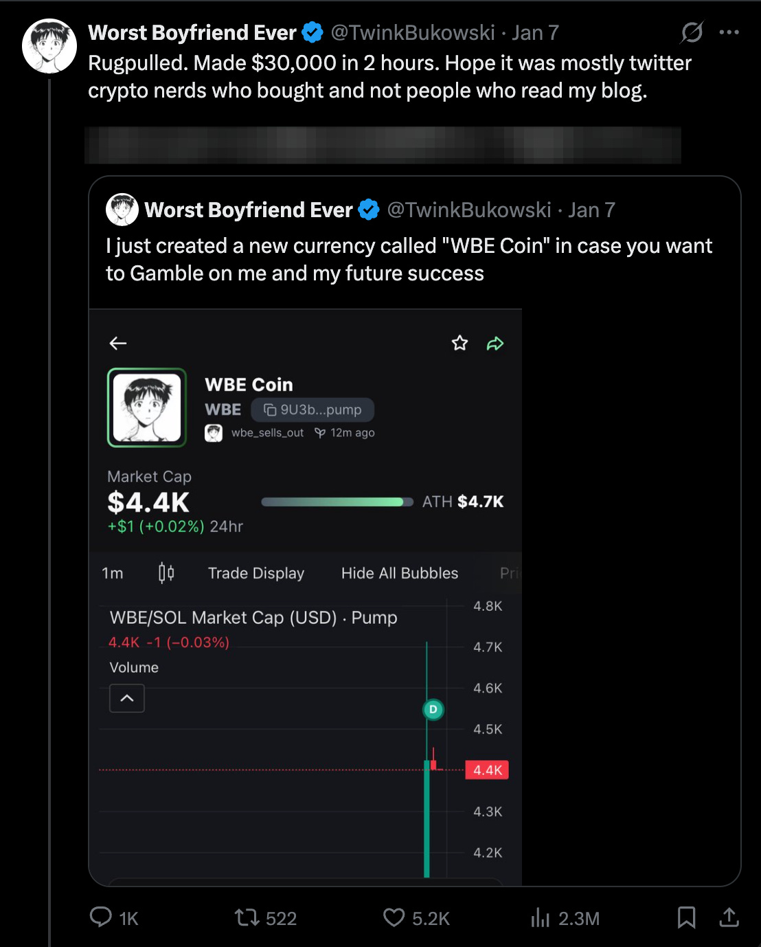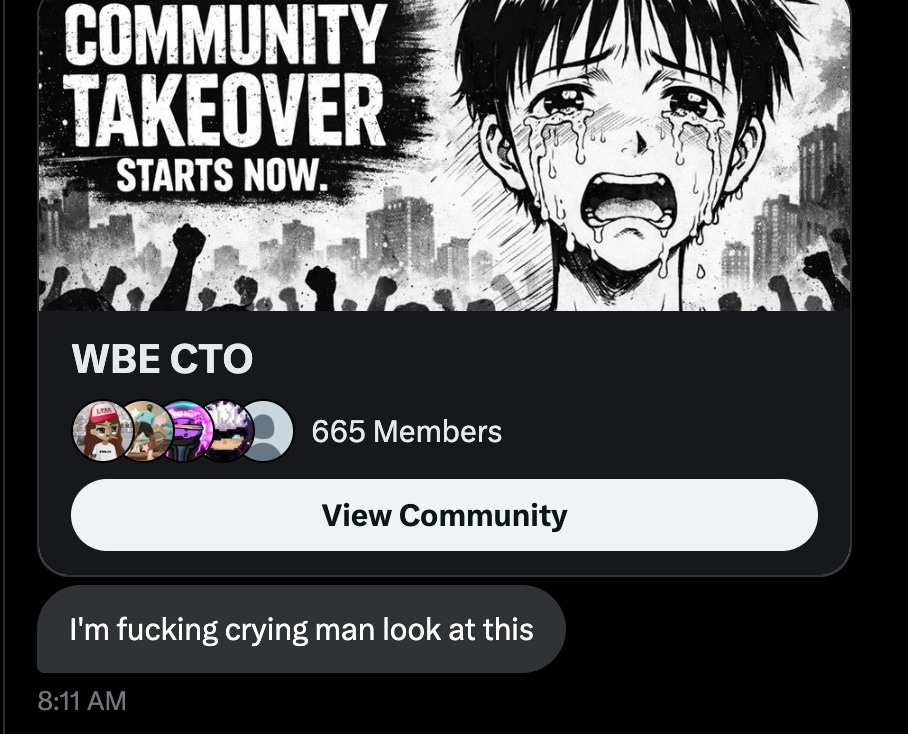 it’s 3 AM. the price of WBE Coin is still going up, people are still buying, i’ve made $5k more in creator fees. i even bought back in myself... attention is the only thing that matters on the internet. even if you say “i rugpulled” -- if you saying that results in the post going more viral, the coin will keep being bought, because again, attention is the only thing that matters on the internet.