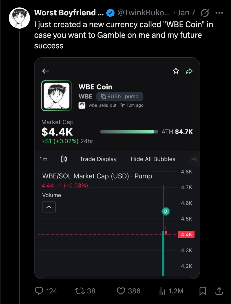 i created “WBE Coin” and posted it on twitter at about 9 PM japanese standard time, which is perfect, because the United States was just waking up. i had just finished another cup of matcha. more caffeine for worst boyfriend ever! i shared the post on substack and twitter, telling people they could “gamble on my future success” … which is, technically, true.