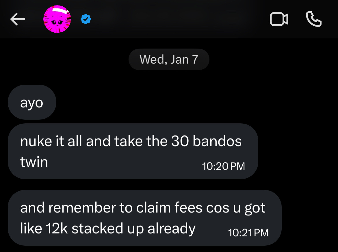 unfortunately he wasn’t close by, he was 2 hours away. he offered to take the bullet train to tokyo right now. i said no it’s fine. i just asked him what he thinks of all this. he said i don’t think you’re doing anything wrong here, man, people can buy if they want and it’s crypto, they know it’s gambling, and you’re worst boyfriend ever… it’s actually completely in-character.