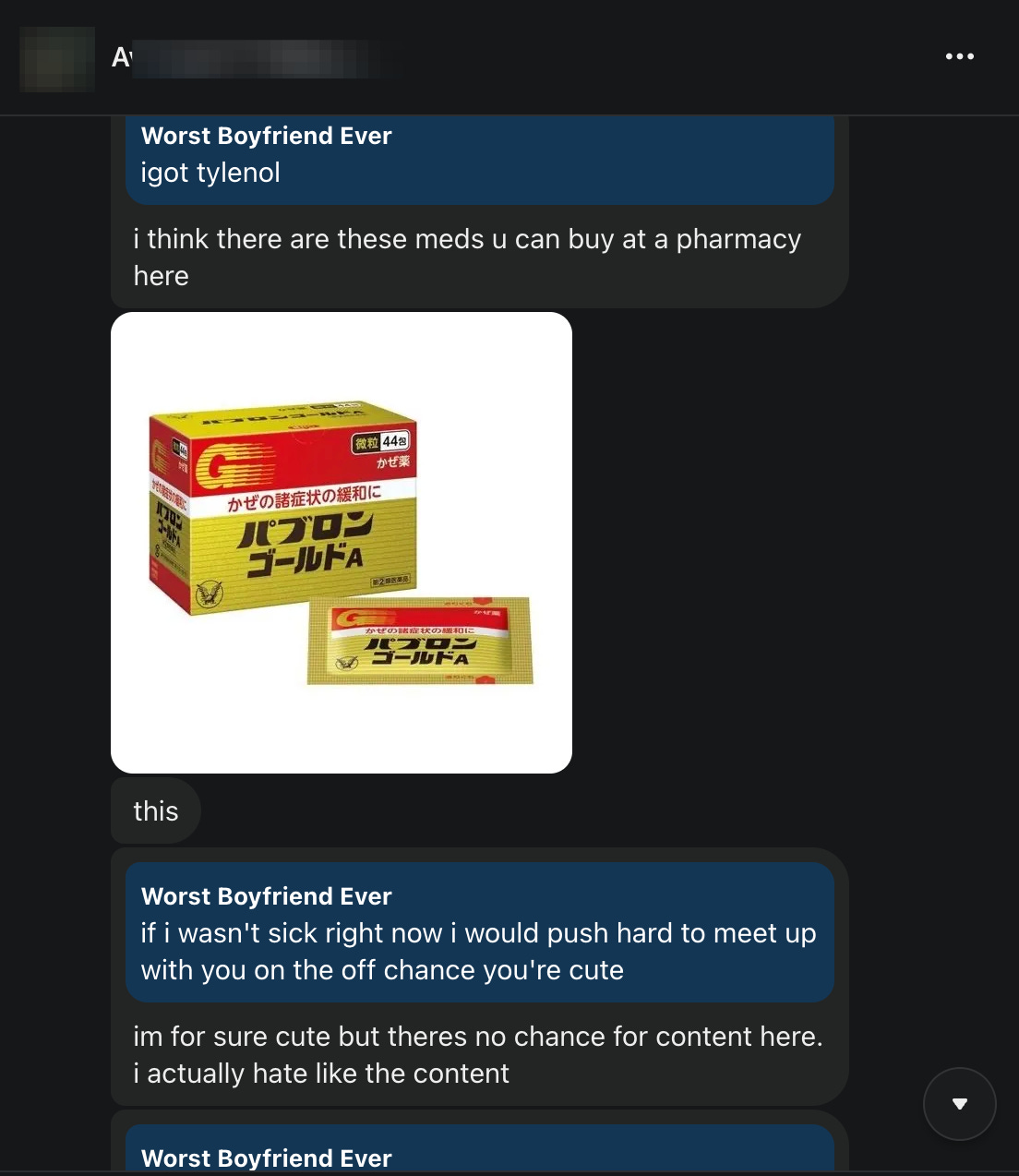 One of the girls in my DMs who was in Tokyo but would not meet up with me told me to buy “Pabron Gold” which is apparently super-effective Japanese cough medicine. I trust the Japanese to make good products and I need all this pain in my body to go away and so I go to the nearest drugstore and buy it.