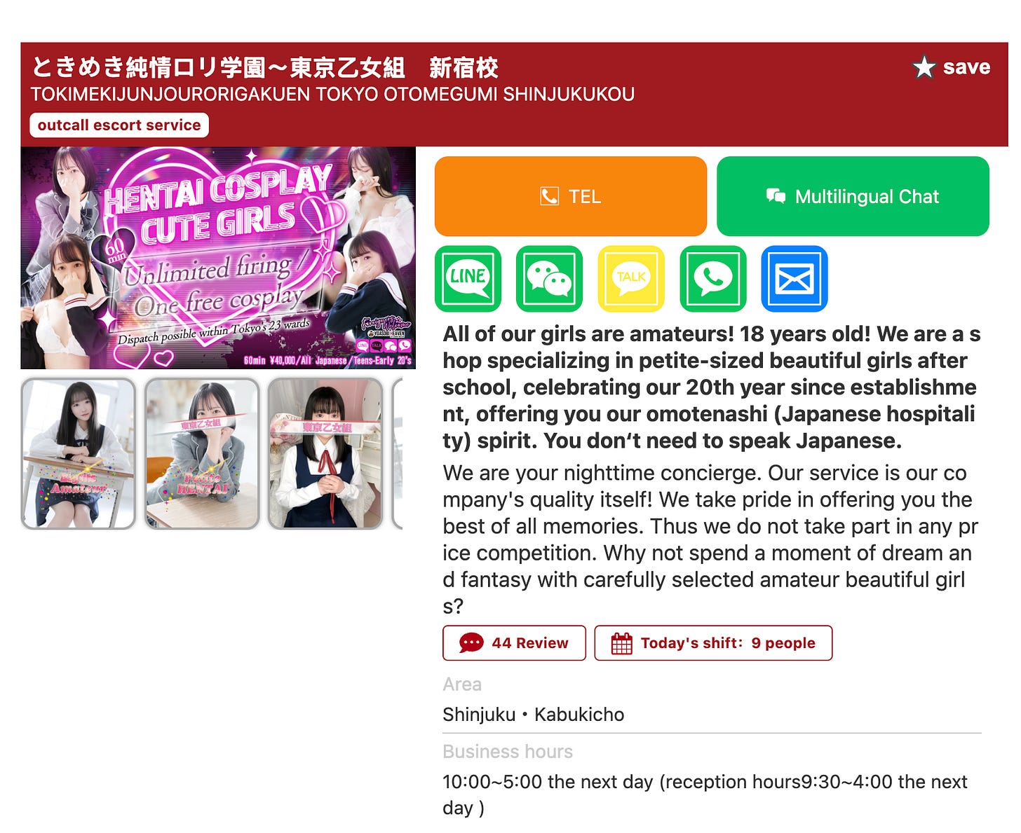 I book “Memi” — who is apparently an 18 year old with big tits, for 9:30 PM. Gave some guy my info over Whatsapp. He asked if I would like for her to show up in “cosplay” — school girl uniform, sailor moon, gym clothes, …