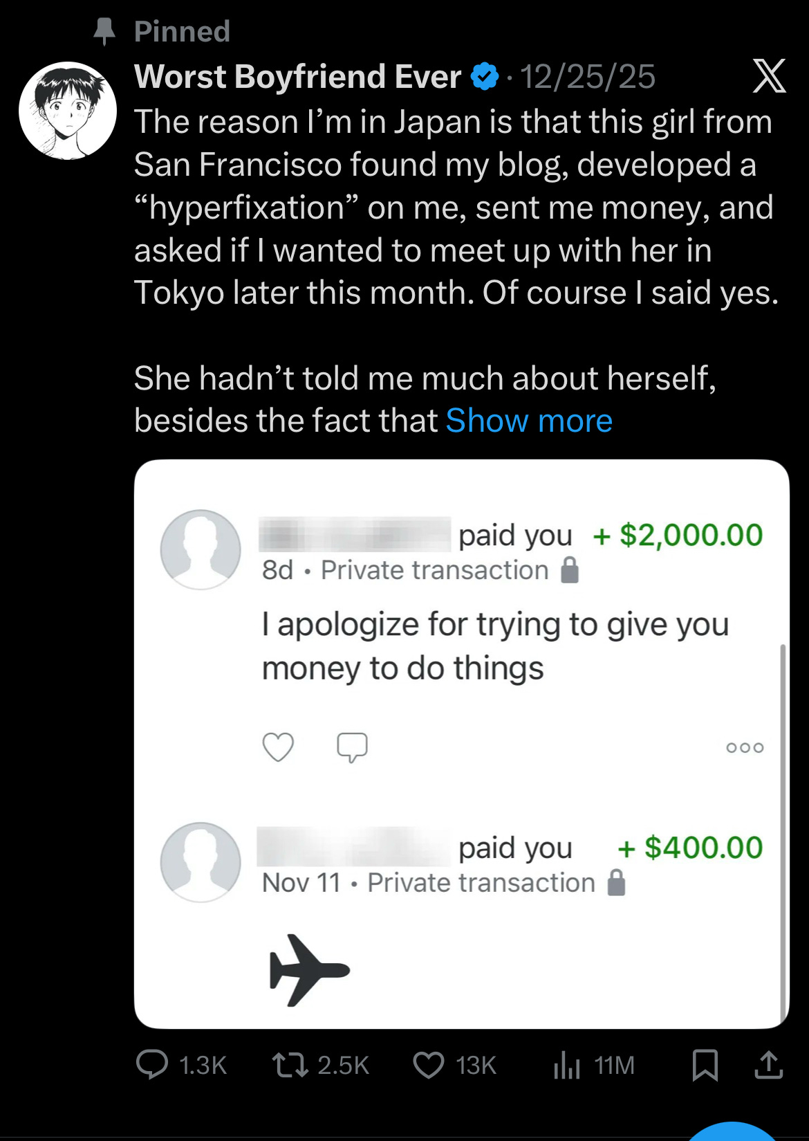 MEANWHILE… my twitter account is blowing up. That story I shared last week about meeting the Japanese Sugar Mama, extorting her for $2k, and running away, now has TEN MILLION VIEWS.